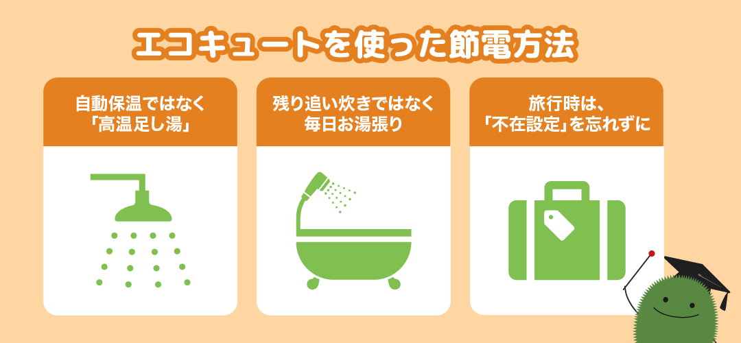 エコキュートを省エネモードに設定すると、お湯の使い過ぎを防いで電気代を節約できます。そのほかにも、以下の方法を用いると、エコキュートの節電が可能です。