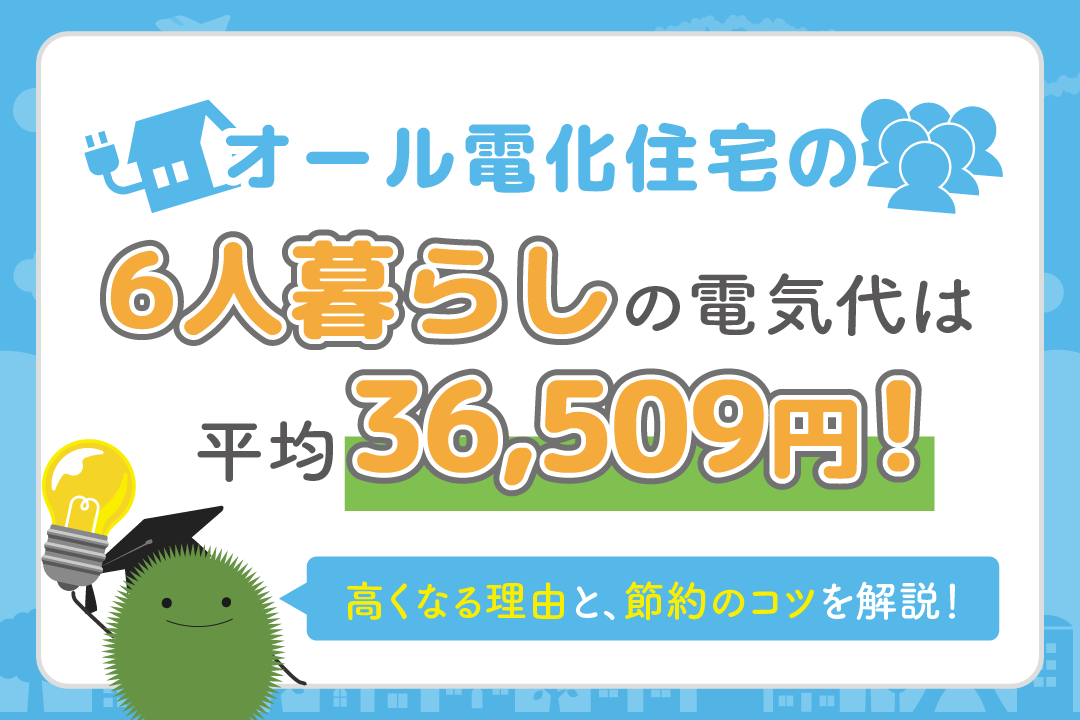 6人家族のオール電化住宅の場合、電気代の平均は36,509円 です。ガス併用住宅の電気料金と比較すると割高ですが、この料金には、調理や入浴などにかかる実質的なガス代も含まれています。