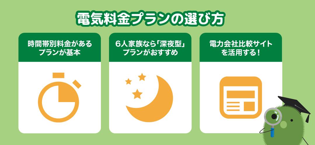 6人家族が電気代を削減するうえで、おすすめの電気料金プランの選び方は、次のとおりです。