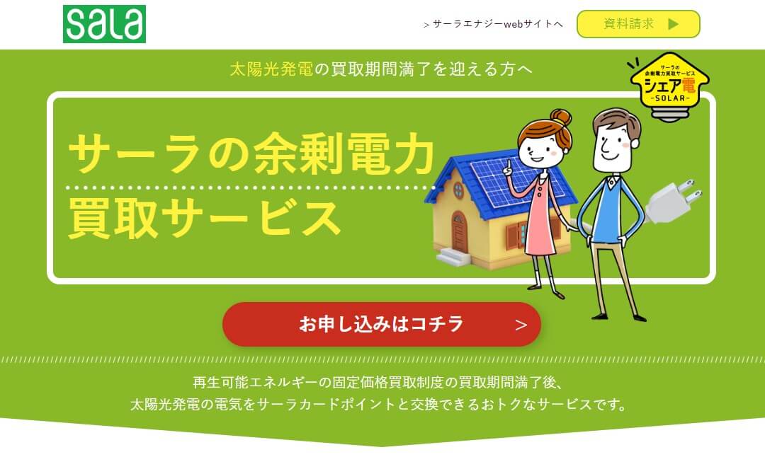 サーラの余剰電気買取サービスは、サーラエナジー株式会社が提供している卒FIT向けの太陽光買取サービスです。