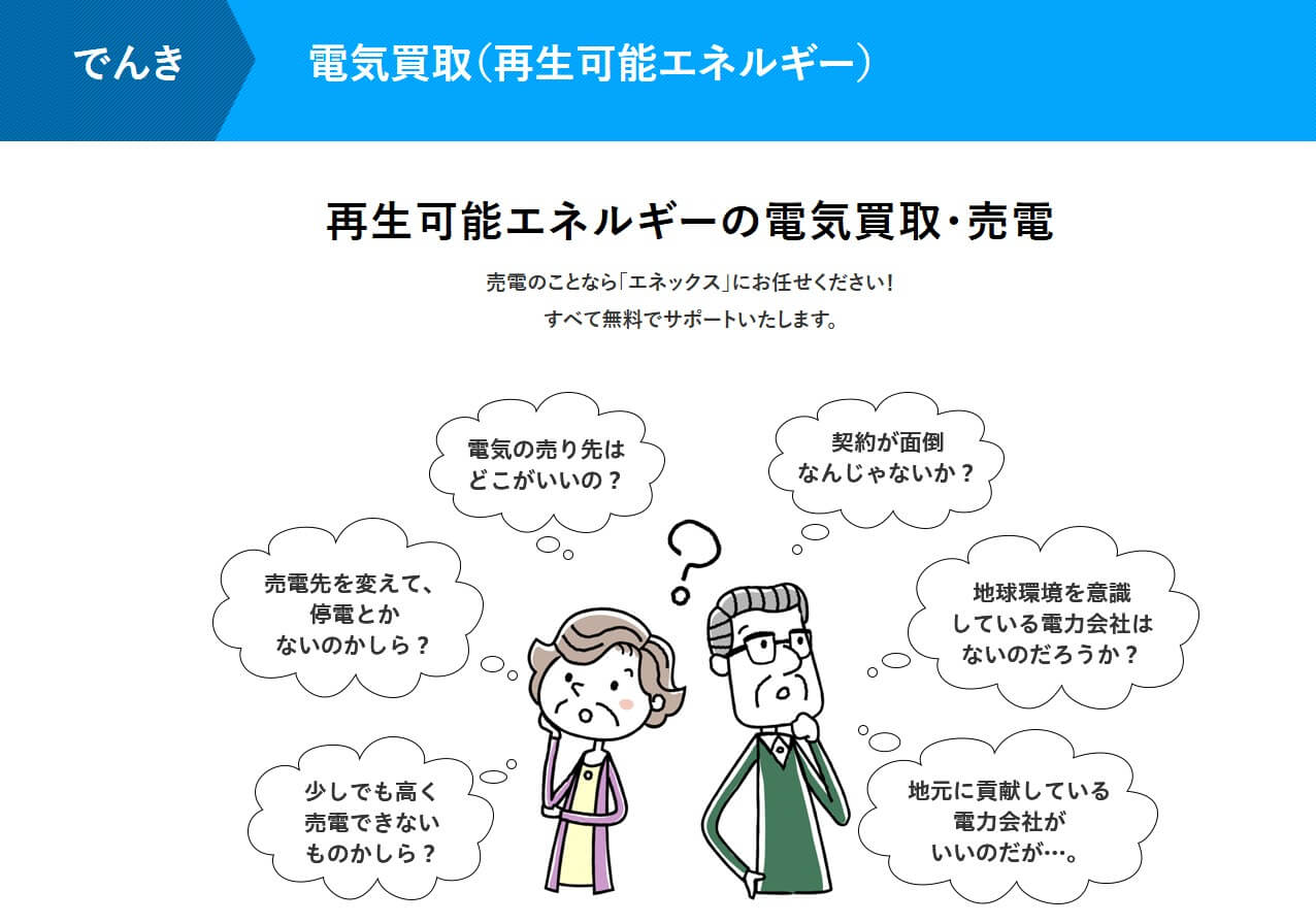 主要業務のひとつとして、電力販売も行っています。電気に関して依頼できるのは、供給だけではありません。卒FIT後にもいくらかの単価で電気の買取を続けているため、エネックスは売電での新たな利用先として確認したい会社といえるでしょう。